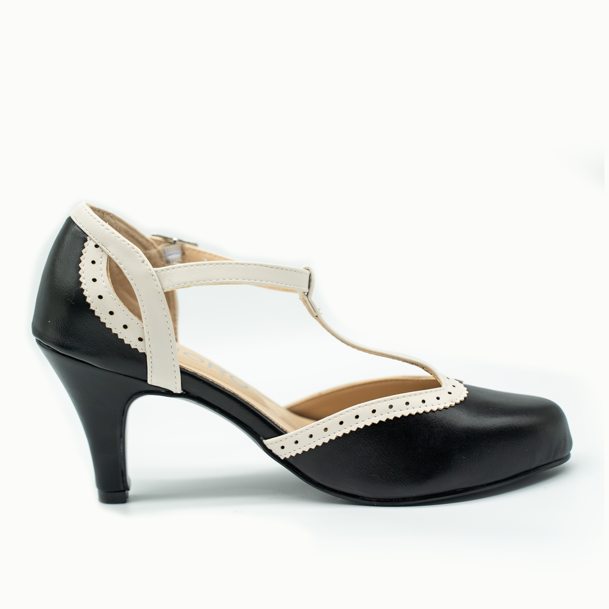 Diseño vintage renovado: Zapato de tacón medio con acabado bicolor que combina tonos neutros en contraste, perfecto para realzar cualquier look.
